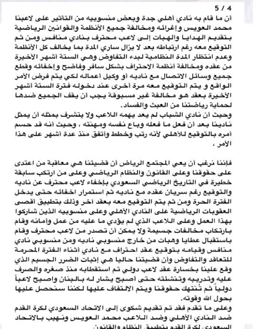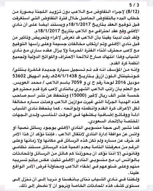 الشباب يطالب في تطبق أقصى العقوبات على الأهلي والعويس