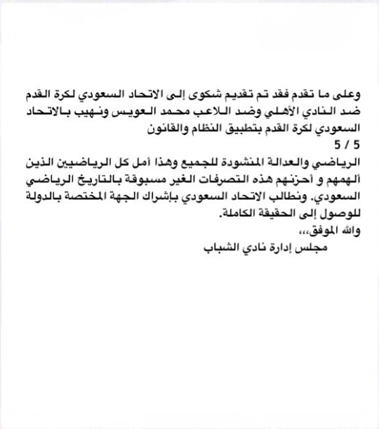 أصدر نادي الشباب اليوم بيانا فيما يخص قضية لاعب الفريق الكروي الأول محمد العويس، مؤكدة أنها توصلت في وقت سابق إلى قناعة بعدم رغبة اللاعب في الاستمرار رغم تقديم النادي عرضا رسميا له، وأن له وجهة أخرى غير الشباب، وأنه على تفاهم سري مسبق مع أحد الأندية.