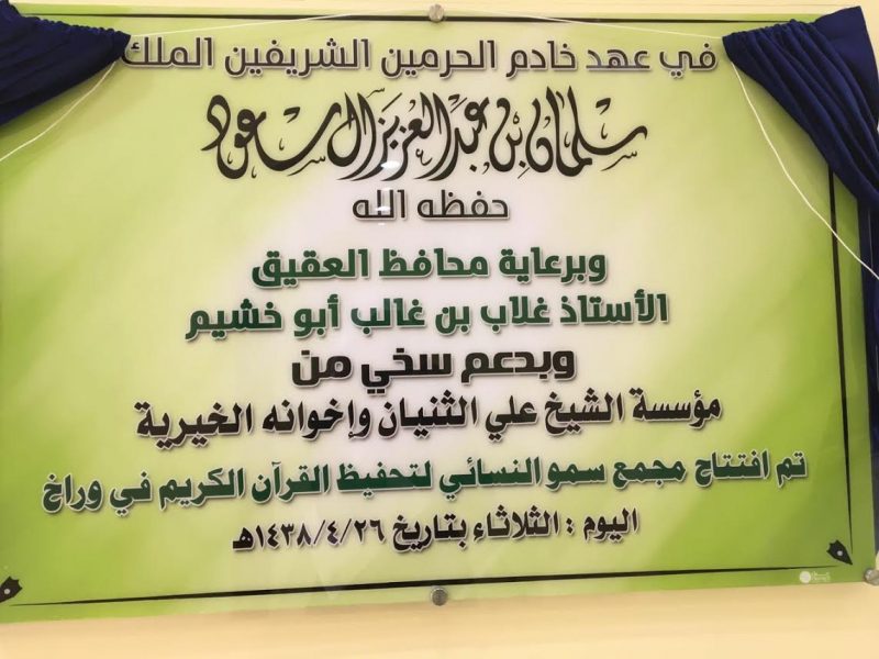 افتتح سعادة محافظ العقيق الأستاذ غلاب بن غالب أبو خشيم مجمع سمو النسائي لحلقات التحفيظ في وراخ التابع لجمعية التحفيظ القرآن الكريم بالعقيق وبحضور نخبة من أصحاب الفضيلة والسعادة وذلك يوم الثلاثاء الموافق ١٤٣٨/٤/٢٦ هـ الساعة الرابعة عصراً .