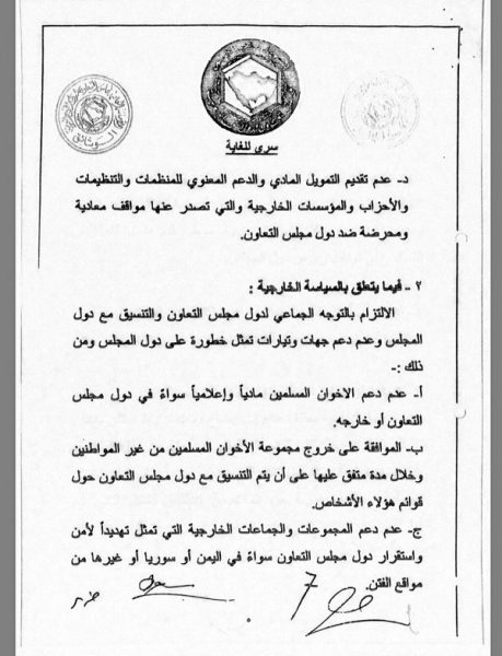 2- عدم دعم الإخوان أو أي من المنظمات أو التنظيمات أو الأفراد الذين يهددون أمن واستقرار دول المجلس عن طريق العمل الأمني المباشر أو عن طريق محاولة التأثير السياسي.