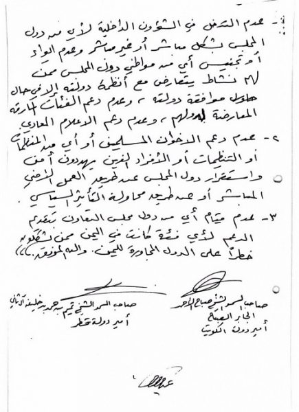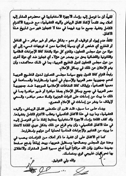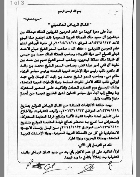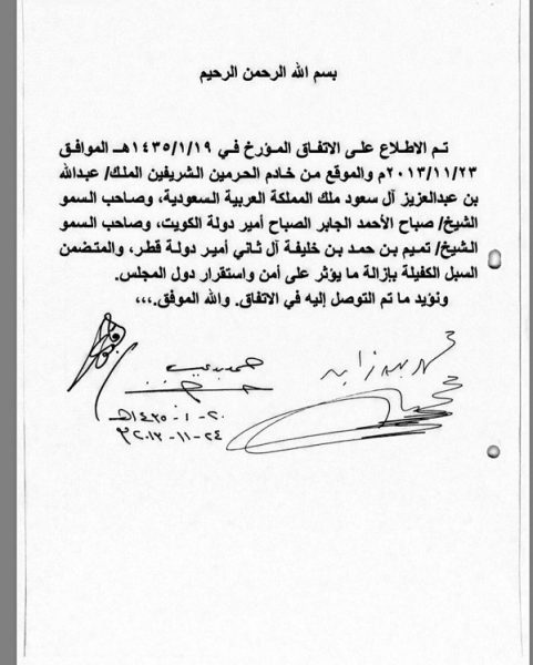وتنص الوثيقة على “إنه في يوم السبت الموافق 19/1/1435 هجري، فقد اجتمع خادم الحرمين الشريفين الملك عبد الله بن عبد الغزيز آل سعود ملك المملكة العربية السعودية، وأخيه صاحب السمو الشيخ صباح الأحمد الجابر الصباح أمير دولة الكويت وأخيه صاحب السمو الشيخ تميم بن حمد بن خليفة آل ثاني أمير دولة قطر في الرياض”.