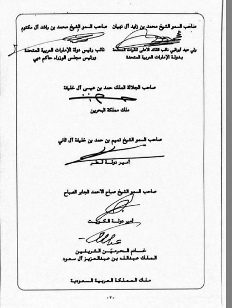 وتضيف الوثيقة المكتوبة بخط اليد “وقد تم عقد مباحثات مستفيضة تم خلالها إجراء مراجعة شاملة لما يشوب العلاقات بين دول المجلس (التعاون الخليجي) والتحديات التي تواجه أمنها واستقرارها والسبل الكفيلة لإزالة ما يعكر صفو العلاقات بينها.”
