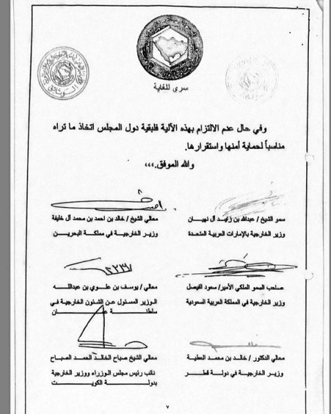 وكشفت الوثائق ورقة أخرى شملت توقيعات وزراء خارجية دول مجلس التعاون الخليجي على آلية تنفيذ الاتفاق الذي ذيل ببند يقضي بأنه “في حال عدم الالتزام بهذه الآلية، فلبقية دول المجلس اتخاذ ما تراه مناسبا لحماية أمنها واستقرارها”.