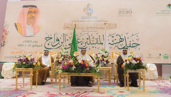 زف صاحب السمو الملكي الأمير الدكتور حسام بن سعود بن عبدالعزيز ، أمير منطقة الباحة أمس ، 750 عريساً وعروسة ، وذلك خلال رعاية سموه للحفل السنوي لتهنئة المقبلين على الزواج بالمنطقة ، الذي نظمه فرع وزارة العمل والتنمية الاجتماعية بالباحة ، وذلك بفندق ساف بمحافظة بلجرشي .