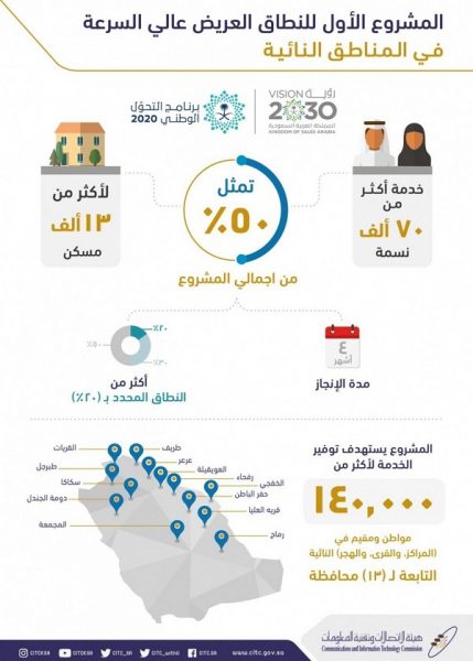 أعلنت هيئة الاتصالات وتقنية المعلومات اليوم عن إنجاز 50% من المشروع الأول للنطاق العريض اللاسلكي عالي السرعة للمناطق النائية قبل الموعد المحدد له في خطة العمل الذي سيستفيد منه أكثر من 70,000 مواطن ومقيم في 13312 مسكناً بالمراكز، والقرى، والهجر التابعة لـ 13 محافظة تشمل محافظات المجمعة ورماح بمنطقة الرياض، ومحافظات الخفجي وحفر الباطن وقريه العليا بالمنطقة الشرقية، وكذلك محافظات القريات ودومة الجندل وسكاكا وطبرجل بمنطقة الجوف، بالإضافة إلى محافظات العويقيلة ورفحاء وطريف وعرعر بمنطقة الحدود الشمالية .