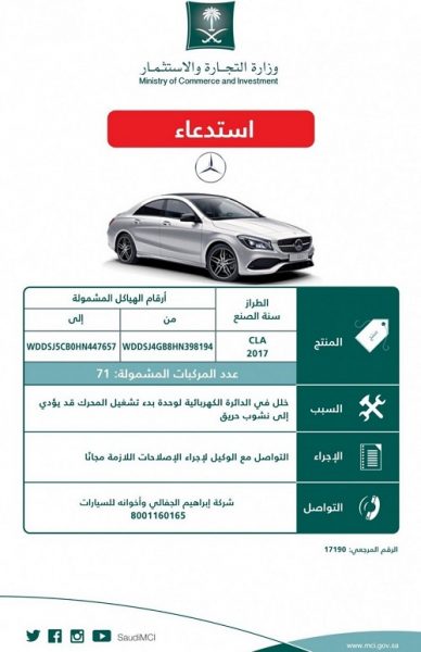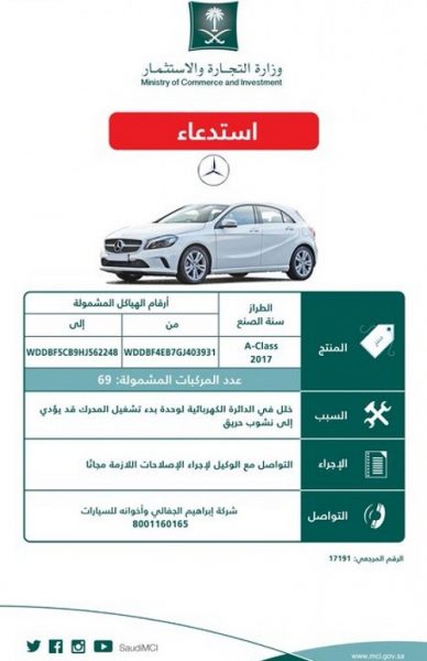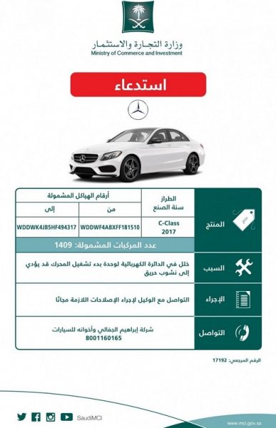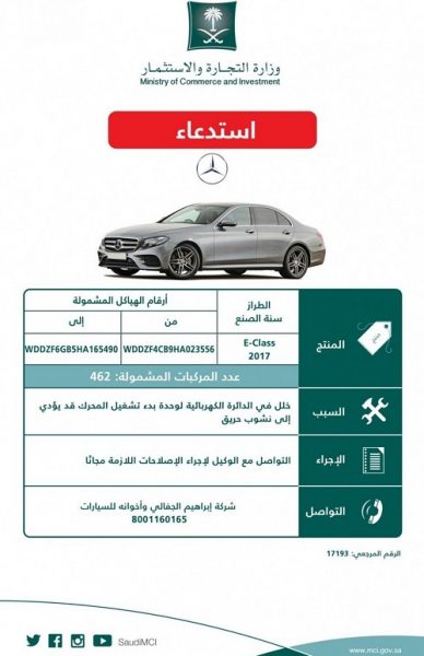 أعلنت وزارة التجارة عن استدعاء طرازات مختلفة لسيارات مرسيدس موديلات 2017م لخلل بالدائرة الكهربائية لوحدة بدء تشغيل المحرك قد يؤدي إلى نشوب حريق.
