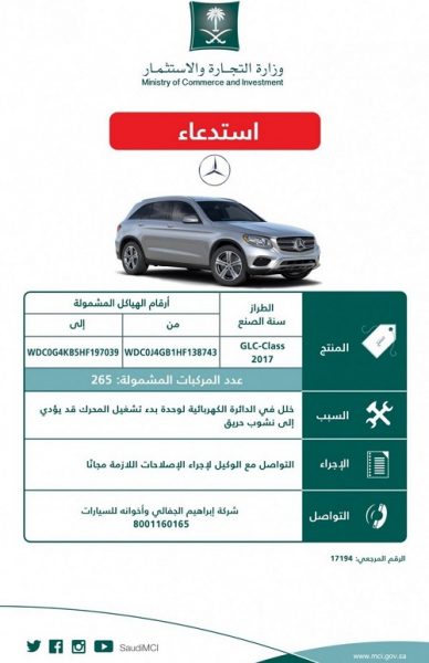 وأوضحت الوزارة في تغريدة عبر حسابها الرسمي بموقع التوصل الاجتماعي “تويتر” أنه تم استدعاء طرازات مختلفة لسيارات مرسيدس موديلات 2017م لخلل بالدائرة الكهربائية لوحدة بدء تشغيل المحرك قد يؤدي إلى نشوب حريق .وحددت نوع الطرازات المستدعاة (E-Class ، A-Class ، C-Class ، GLC ، CLA )، وطالبت الوزارة المستهلكين بضرورة التواصل مع الوكيل، المعتمد في المملكة شركة ابراهبم الجفالي واخوانه لإجراء الإصلاحات اللازمة مجاناً.