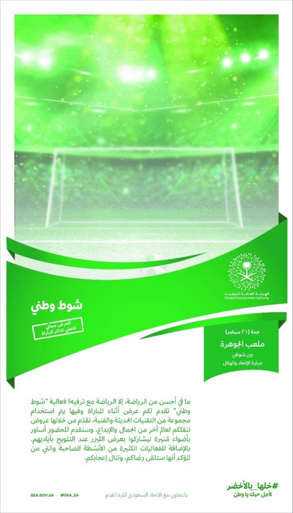 تزامناً مع الاحتفال باليوم الوطني الـسابع والثمانون، تنظم الهيئة العامة للترفيه لأول مرة فعالية بعنوان “شوط وطني ” بملعب الجوهرة المضيئة بمدينة جدة اليوم الخميس المقبل الموافق 21 سبتمبر والتي ستقام بين شوطي مباراة الكلاسيكو التي ستجمع فريقي الإتحاد والهلال.