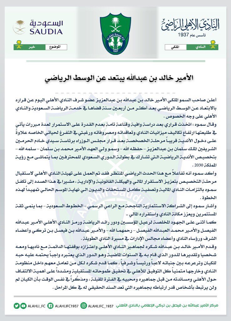 النادي الأهلي يُعلن ابتعاد خالد بن عبدالله عن الوسط الرياضي