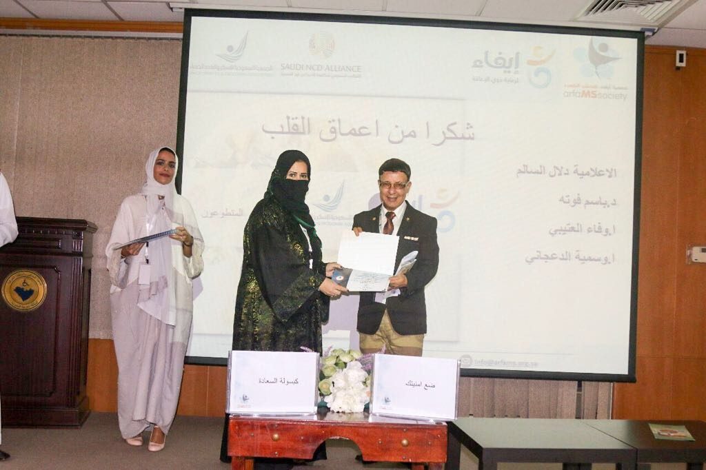 من جهته، أوضح عبدالعزيز التركي رئيس مجلس إدارة جمعية أرفى للتصلب العصبي المتعدد أهمية هذا البرنامج للمصابين حيث قال: برنامج حياتي تفاؤل هو من البرامج النوعية بالجمعية والتي لامسنا أثرها على المصابين بشكل عام وهو يهدف لتبادل التجارب بين المصابين والعمل على رفع معنويات المرضى والتركيز على الإيجابية ونشر التفاؤل، وأضاف التركي حرصا من الجمعية على المصابين ومعرفتها بأهمية التغذية للمصاب كانت هذه المشاركة والتي ستستمر إن شاء الله للقاءات قادمة من خلال التعاون مع جمعية السكر والغدد الصماء عضو التحالف السعودي للجمعيات للأمراض الغير معدية وذلك لتثقيف المستفيدين وبما يتناسب مع حالتهم الصحية.