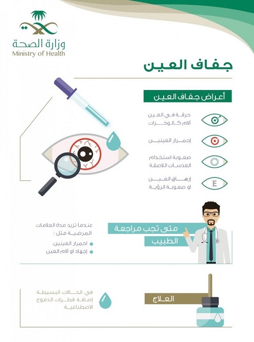 وفي هذا الصدد، نشرت وزارة الصحة، عبر حسابها على موقع “تويتر” رسماً توضيحياً (إنفوجراف) حول مشكلة جفاف العين، والأعراض المصاحبة لها، والعلاج، والوقت الذي ينبغي فيه زيارة الطبيب للفحص.
