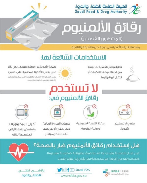 حذرت الهيئة العامة للغذاء والدواء من استخدام رقائق الألمونيوم “القصدير” لطهي أو تسخين الطعام، لكونها غير معدّة لتلك الاستخدامات.