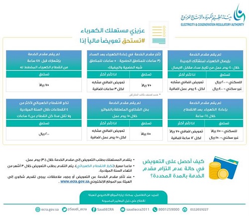 وأبانت أنه في حالة تأخر مقدم الخدمة في إعادة الكهرباء بعد السداد 3 ساعات للمناطق الحضرية و5 ساعات للمناطق شبه الحضرية الريفية، فإن المستهلك يستحق 75 ريالاً، وتعويضا إضافياً مماثلاً عن كل 3 ساعات إضافية.
