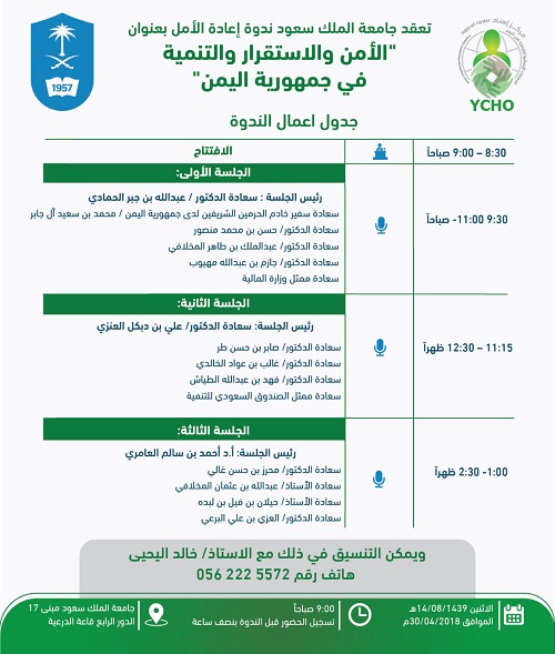 برعاية مدير جامعة الملك سعود الدكتور بدران عبدالرحمن العمر، تنظم الجامعة ممثلة في وكالة الدراسات العليا والبحث العلمي يوم الاثنين 30 أبريل الجاري، ندوة بعنوان «إعادة الأمل.. الأمن والاستقرار والتنمية في اليمن».