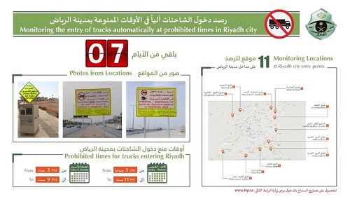 وشدد المرور على أن أوقات منع دخول الشاحنات إلى الرياض يبدأ من الساعة 5 صباحاً وحتى الساعة 11 مساء، داعياً سائقي الشاحنات إلى الالتزام به، فيما حدد 11 موقعاً لرصد الشاحنات المخالفة في مداخل مدينة الرياض.