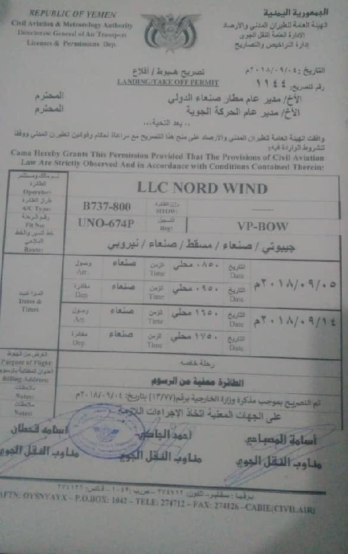 وحصل المشهد اليمني على صورة من التصريح الرسمي بالموافقة على إقلاع طائرة وفد الحوثيين من مطار صنعاء موضحاً خط سيرها.
