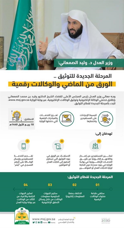 وجه وزير العدل الدكتور وليد بن محمد الصمعاني بإطلاق خدمة إصدار الوكالة وتوثيقها إلكترونياً عبر بوابة وزارة العدل www.moj.sa، وبدء مرحلة جديدة في التحول الرقمي لقطاع الوكالات والتوثيق.