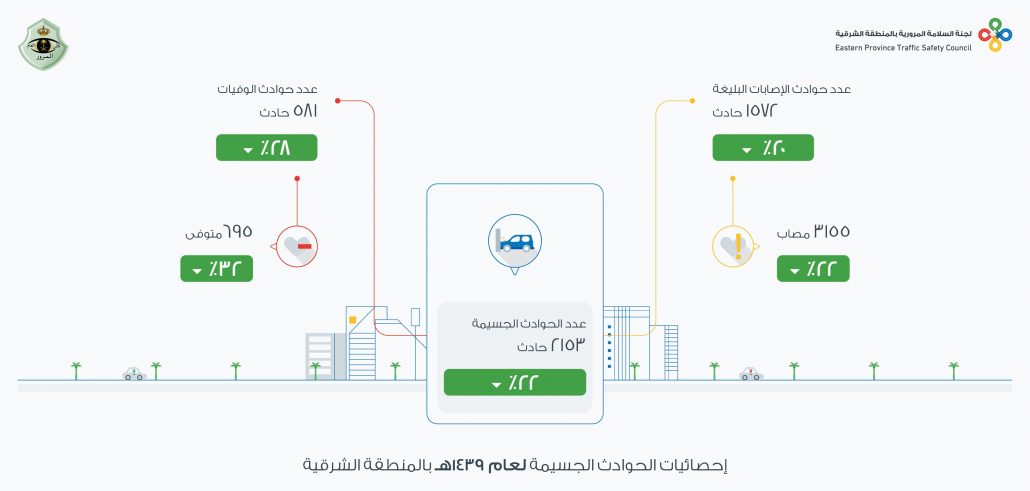 وأشار الراجحي في سياق عرضه، أن عدد الحوادث الجسيمة والتي تشمل حوادث الوفيات والإصابات البليغة قد انخفضت في عام 1439 هـ بنسبة 22% مقارنة بالعام الذي سبقه. ونتج عن ذلك، انخفاض في نسبة المتوفين بنسبة 32% حيث بلغ عدد المتوفين 695 وفاة وقد إنخفض عدد المصابين جراء الحوادث الجسيمة بنسبة 22% حيث بلغ عدد المصابين اصابات بليغة 3155 مصاب كما هو موضح في الإنفو جرافيك المرفق.