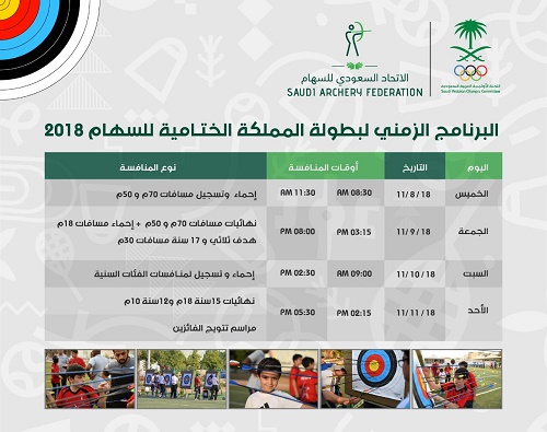 تنطلق غداً “الجمعة” بطولة المملكة الختـامية للسهام 2018 بمشاركة 65 رامياً من كافة الأعمار و الجنسيات والتي يحتضنها ميدان السهام بمجمع الأمير فيصل بن فهد الأولمبي بمدينة الرياض.