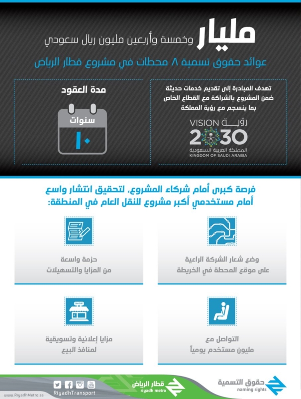 ويهدف برنامج تخصيص حقوق تسمية عدد من محطات قطار الرياض إلى تحقيق عوائد للمشروع يتم استثمارها في دعم استدامته وتطوير خدماته وخفض تكاليفه التشغيلية، وتقديم خدمات حديثة لمستخدميه بالشراكة مع القطاع الخاص.
