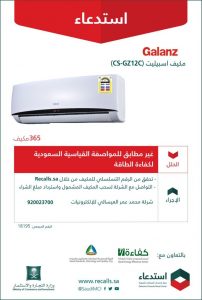 أعرب مواطنون عن استيائهم بعد اعلان وزارة التجارة والاستثمار عن استدعاء مكيف سبيلت ” Galanz ” نظرا لعدم مطابقته مع المواصفات القياسية السعودية لكفاءة الطاقة.