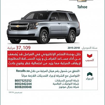 أعلنت وزارة التجارة والاستثمار اليوم استدعاء 93.253 سيارة (جنرال موتورز) لوجود خلل ببرمجة وحدة التحكم الإلكتروني في الفرامل قد يضعف من أداء مساعد الفرامل ويزيد المسافة المطلوبة لإيقاف المركبة مما يزيد من احتمالية وقوع حادث.