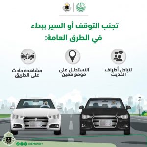 وقال المرور: إنه يجب على قائدي المركبات عدم التوقف أو السير ببطء في الطرق العامة، وذلك لتبادل أطراف الحديث، أو الاستدلال على موقع معين، أو لمشاهدة حادث على الطريق.