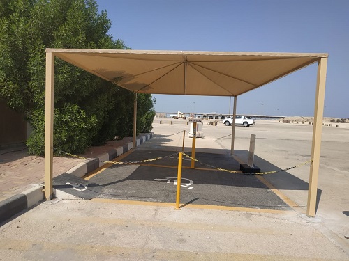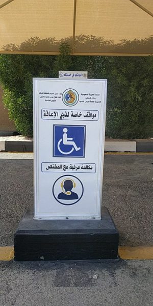 حيث تم إنشاء مواقف للسيارات مجهزة بمظلة ومسار للعربات المتحركة مخصص فقط (لذوي الإعاقة) . وكذلك ربط موقف السيارات باتصال مرئي مع العاملين بالقطاع لتمكينهم من الخدمة المطلوبة وتقديمها لهم دون الحاجة إلى نزولهم. كما تم تخصيص موظف لإنجاز المعاملات الخاصة بهم.