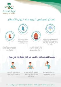 وقالت الوزارة إنه عند اضطرار مريض الربو للخروج في الأجواء الماطرة يجب عليه تغطية الرأس والفم والأنف.