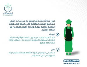 ونشرت حماية المستهلك إنفوجراف على حسابها بموقع التدوينات القصيرة تويتر، وعلقت عليه: “لا تتورط مثل عبدالله، قدِّم بلاغك فورًا عند هروب العمالة المنزلية”.