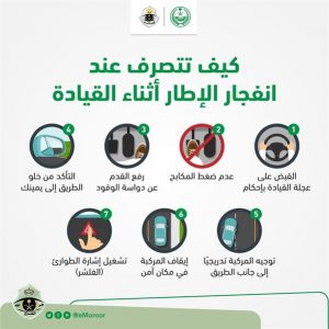 وأكدت أن التصرف الصحيح لحظة انفجار الإطار المفاجئ أثناء القيادة، يساهم في الحفاظ على سلامة قائدي المركبة ومستخدمي الطريق.