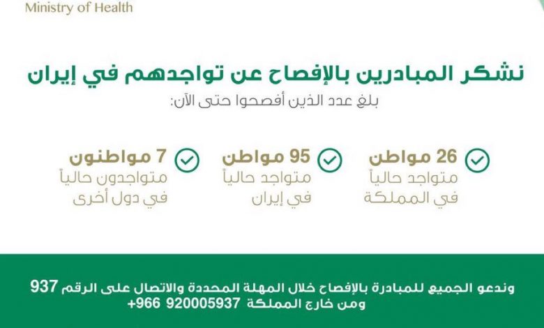 وأوضحت أن 26 مواطن متواجد حالياً في المملكة، و 95 مواطن متواجد حالياً في إيران، و 7 مواطنون متواجدون حالياً في دول أخرى.