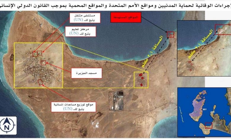 وأوضح العقيد المالكي أن الأهداف المدمرة شملت عدد ( 6 ) مواقع لتجميع وتفخيخ واطلاق الزوارق المفخخة والمسيّرة عن بعد وكذلك الألغام البحرية، حيث يتم استخدام هذه المواقع للإعداد لتنفيذ الأعمال العدائية والعمليات الارهابية والتي تهدد خطوط الملاحة البحرية والتجارة العالمية بمضيق باب المندب وجنوب البحر الأحمر، مبيناً أن عملية الاستهداف تتوافق مع القانون الدولي الإنساني وقواعده العرفية وتم اتخاذ الإجراءات الوقائية لحماية المدنيين ومواقع الأمم المتحدة والمنظمات الدولية الغير حكومية والتي تبعد مسافة ( 2.1 ) كلم من المواقع المستهدفة.