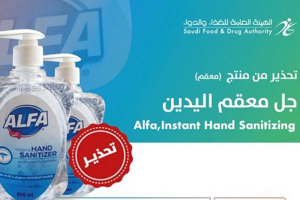 حذّرت الهيئة العامة للغذاء والدواء من جل معقم لليدين يحمل اسم “Alfa,Instant Hand Sanitizing” وينتجه مصنع الكيماويات الحديثة، بسبب احتوائه على نسبة عالية من الكحول الميثيلي (ميثانول).