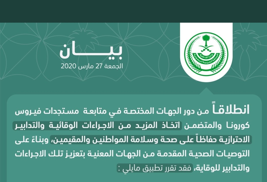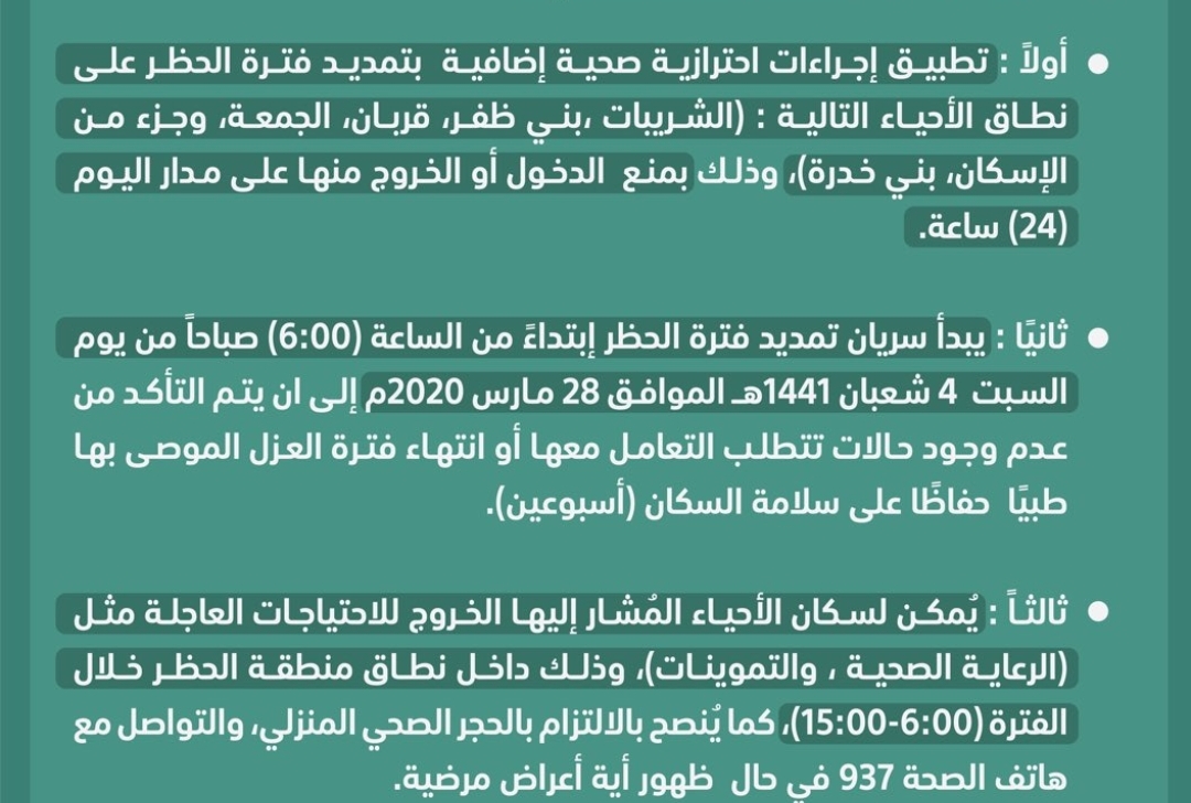 تطبيق إجراءات احترازية صحية إضافية لمكافحة فيروس ‎#كورونا على نطاق الأحياء:(الشريبات ،بني ظفر، قربان، الجمعة، وجزء من الإسكان، بني خدرة) ومنع الدخول أو الخروج منها على مدار اليوم (24) ساعة إبتداءً من 6:00 صباح يوم غدٍ السبت 4 شعبان 1441هـ لمدة أسبوعين.