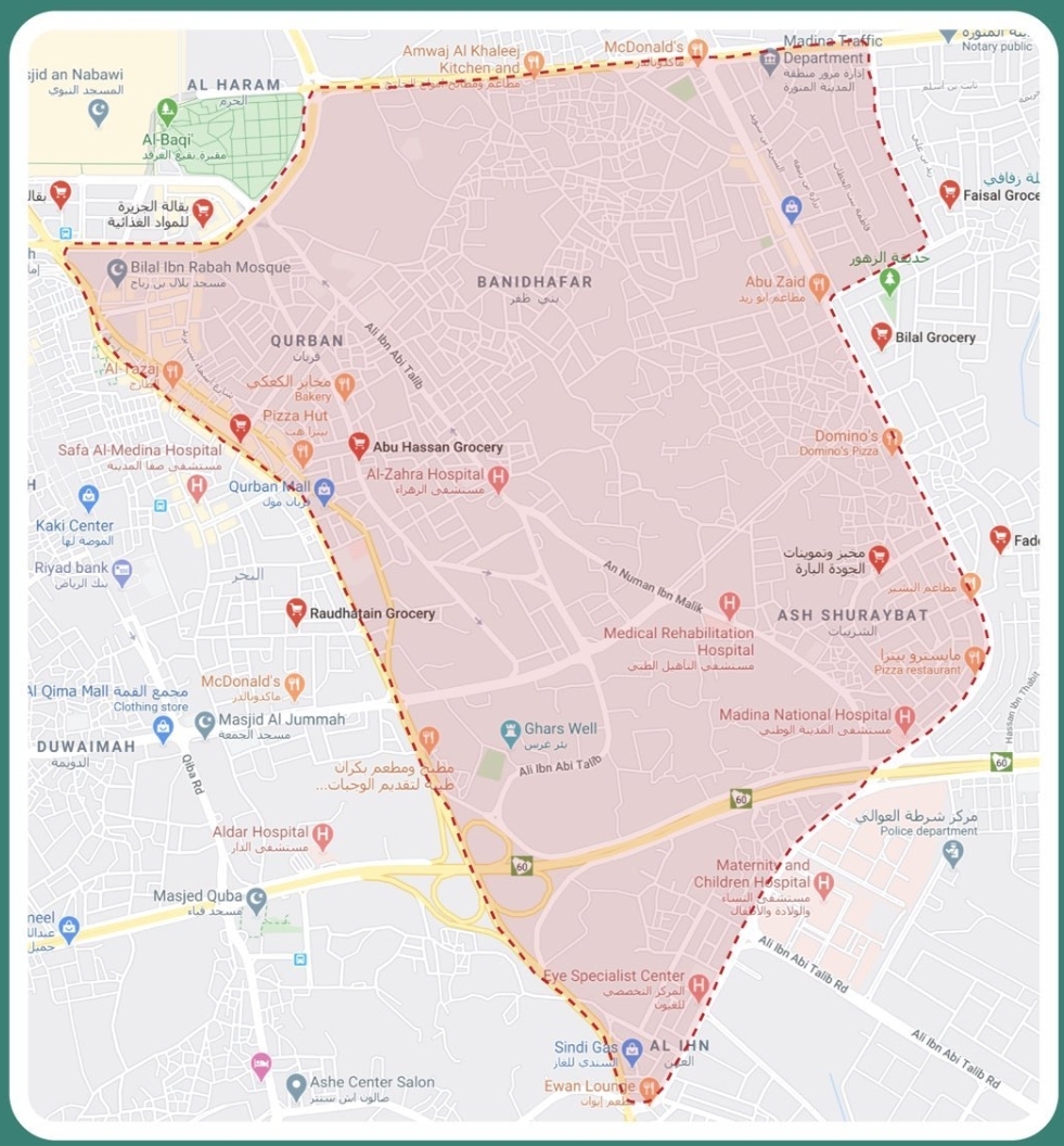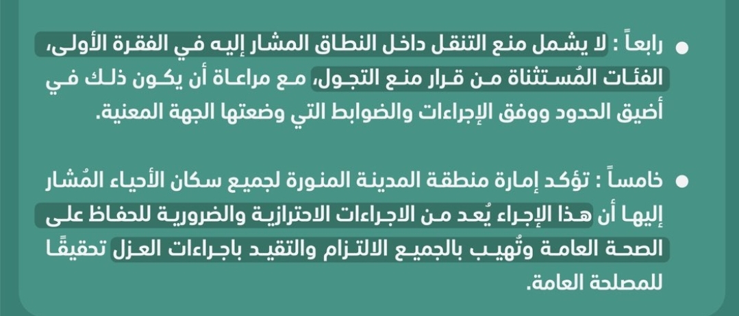 تطبيق الحظر و منع الدخول و الخروج ٢٤ ساعة على هذه الأحياء في المدينة المنورة