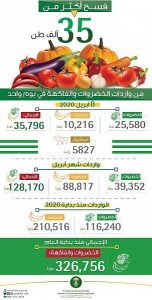أكدت وزارة البيئة والمياه والزراعة، أن واردات المملكة من الخضار والفاكهة التي فسحتها محاجر الوزارة يوم الأربعاء 8 أبريل الحالي، بلغت نحو 35,7 ألف طن.