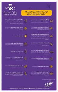قدمت وزارة الصحة عدة نصائح وتوصيات للمواطنين الراغبين في العودة إلى المملكة وشددت على ضرورة اتباعها والالتزام بها، قبل وأثناء وبعد السفر.