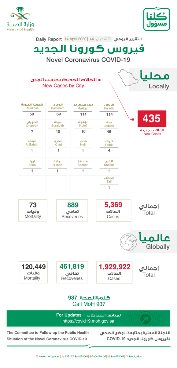 أعلنت وزارة الصحة، اليوم (الثلاثاء)، تسجيل 435 حالة جديدة مؤكدة بفيروس كورونا المستجد (كوفيد 19)، ليرتفع إجمالي عدد الحالات في المملكة إلى 5369 حالة.