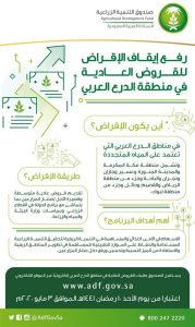 وكانت قد صدرت مؤخراً الموافقة السامية على رفع إيقاف الإقراض للقروض العادية في منطقة الدرع العربي، بحيث يكون الإقراض في المناطق التي تتوفر فيها المياه المتجددة حسب الميزة النسبية لكل منطقة.