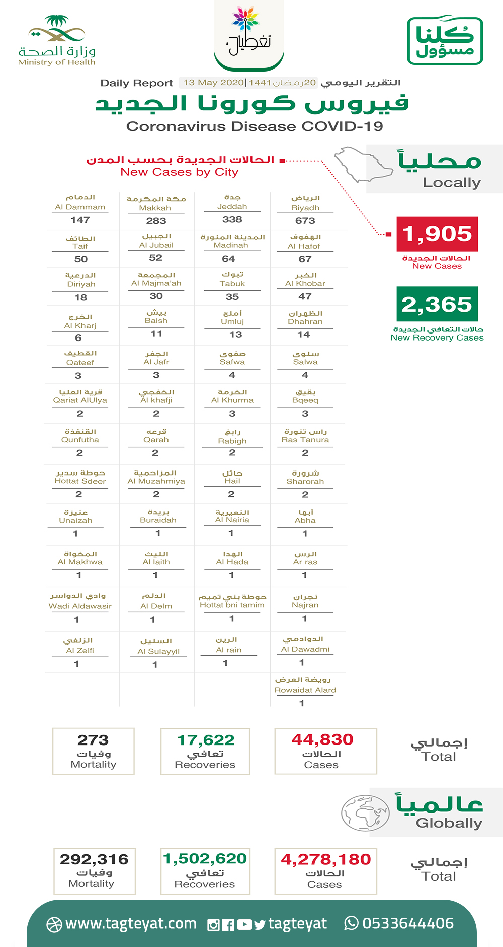 أعلنت وزارة الصحة، اليوم (الأربعاء)، تسجيل 1905 إصابة جديدة مؤكدة بفيروس كورونا المستجد (كوفيد 19)، ليرتفع إجمالي عدد الحالات في المملكة إلى 44830 حالة.