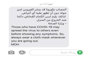 كما جاءت الرسالة باللغة الإنجليزية أيضًا : «Those who have COVID-19 may spread the virus to others even before showing any symptoms. So, always wear a cloth mask whenever you are going out. MOH».