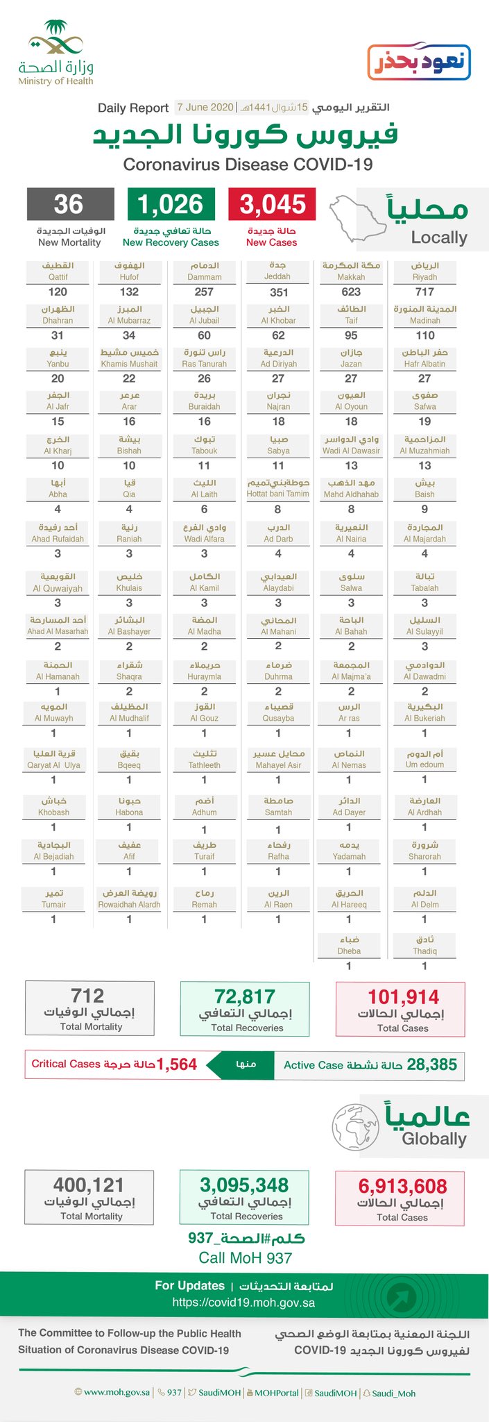 أعلنت وزارة الصحة، اليوم (الأحد)، تسجيل3045 حالة إصابة مؤكدة جديدة بفيروس كورونا المستجد (كوفيد 19)، خلال الـ24 ساعة الماضية، ليرتفع إجمالي عدد الحالات في المملكة إلى 101914حالة.