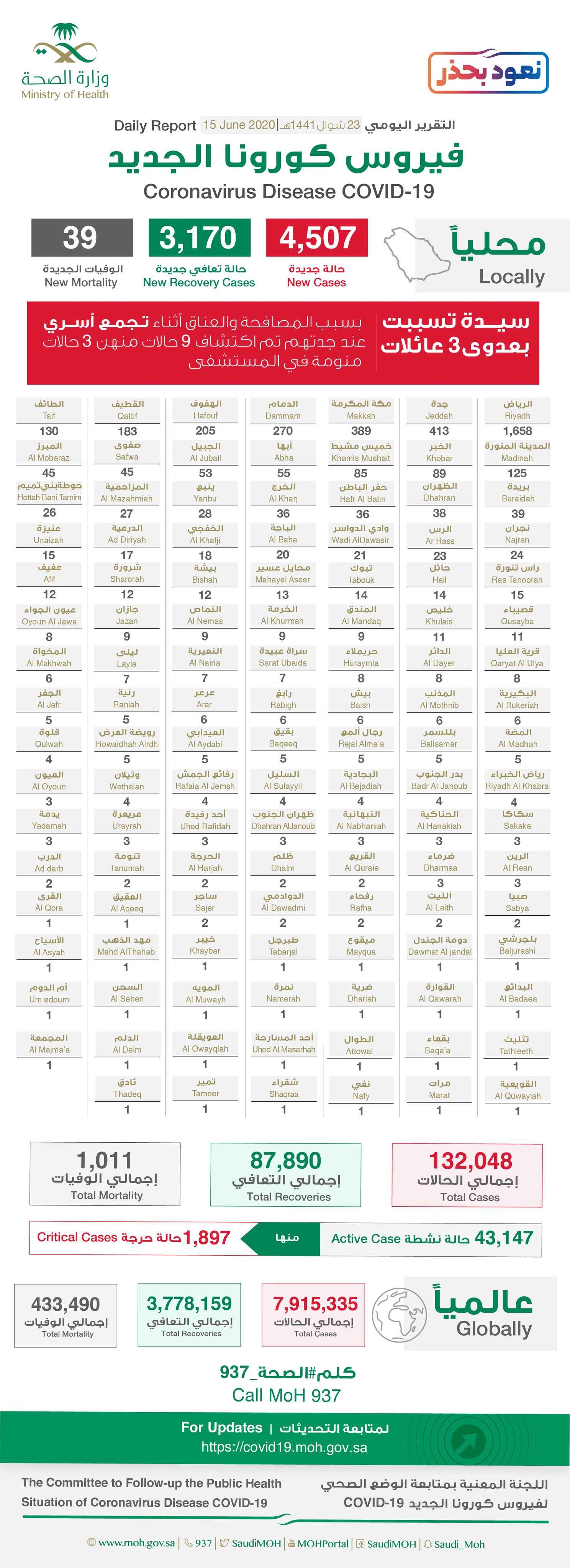 أعلنت وزارة الصحة، اليوم تسجيل 4507 حالة إصابة جديدة مؤكدة بفيروس كورونا المستجد (كوفيد 19)، ليرتفع إجمالي عدد الحالات في المملكة إلى 132048 حالة.