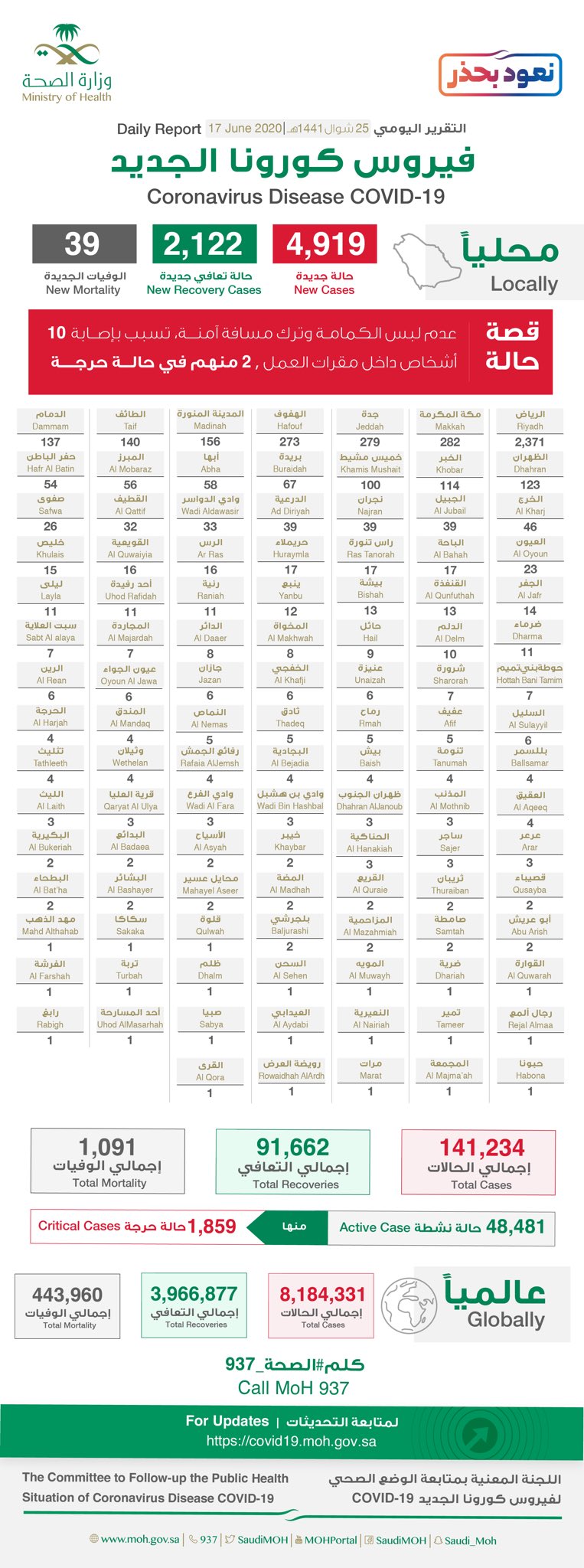 أعلنت وزارة الصحة، اليوم، تسجيل 4919 حالة إصابة جديدة مؤكدة بفيروس كورونا المستجد (كوفيد 19)، ليرتفع إجمالي عدد الحالات في المملكة إلى 141234 حالة.