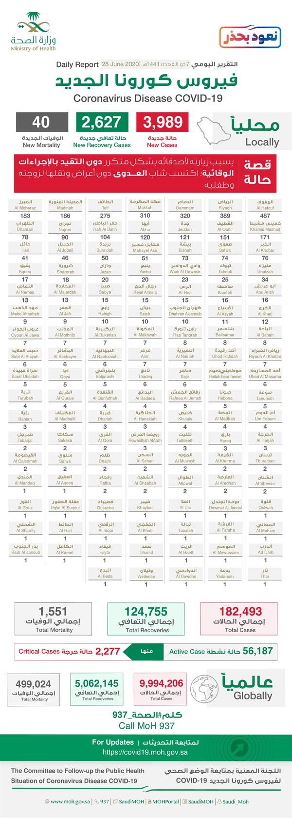 أعلنت وزارة الصحة، اليوم (الأحد)، تسجيل 3989 حالة إصابة جديدة مؤكدة بفيروس كورونا المستجد (كوفيد 19)، ليرتفع إجمالي عدد الحالات في المملكة إلى 182493 حالات.