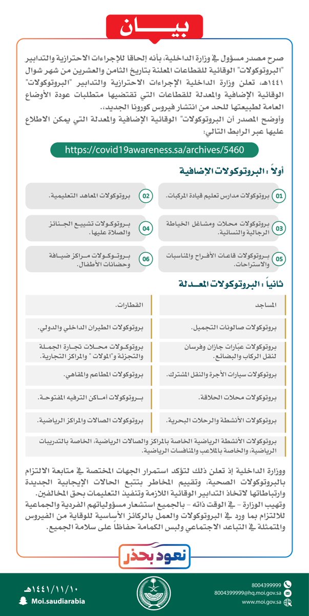 وأوضح المصدر أن “البروتوكولات” الوقائية الإضافية والمعدلة يمكن الاطلاع عليها عبر الرابط الآتي: ‏ https://covid19awareness.sa/archives/5460، وتشمل الآتي: