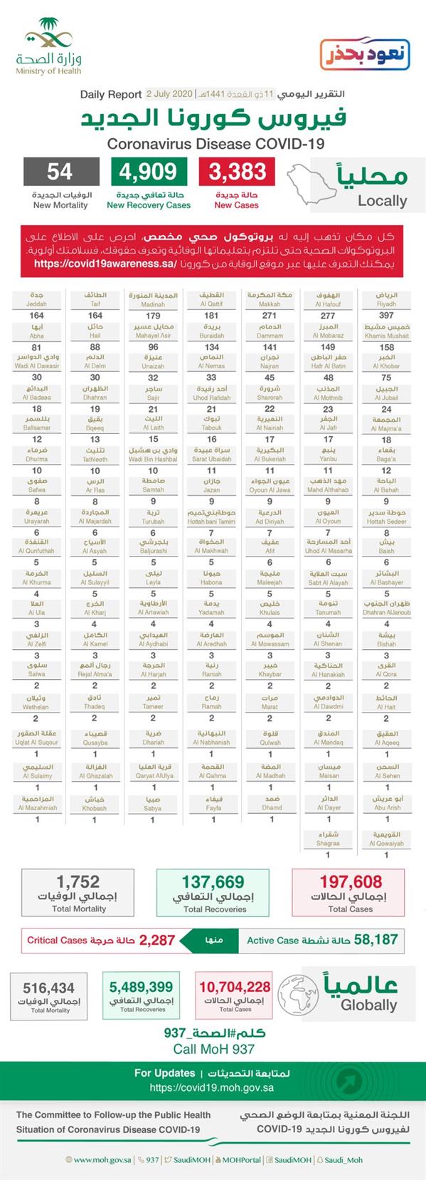 أعلنت وزارة الصحة، اليوم (الخميس) تسجيل 3383 حالة إصابة جديدة مؤكدة بفيروس كورونا المستجد (كوفيد 19)، ليرتفع إجمالي عدد الحالات في المملكة إلى 197608 حالة.