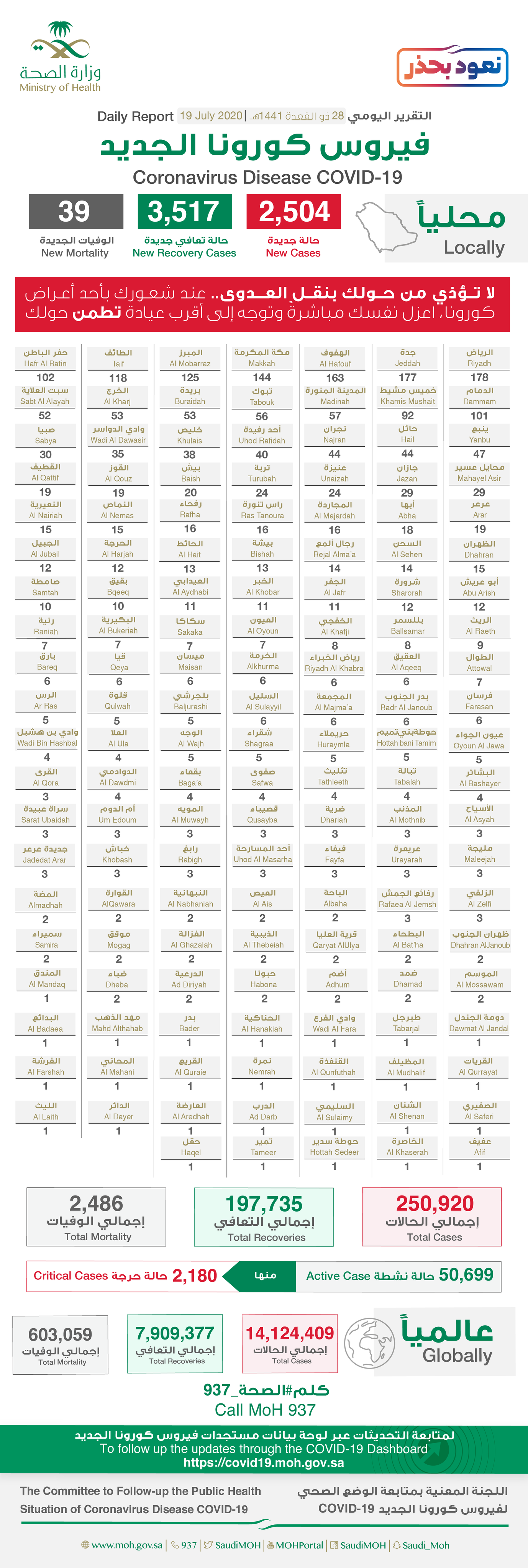 أعلنت وزارة الصحة، اليوم الأحد 19 يوليو 2020، تسجيل 2504 حالة إصابة جديدة بفيروس كورونا الجديد (كوفيد-19) ليصبح الإجمالي 250920 حالة .