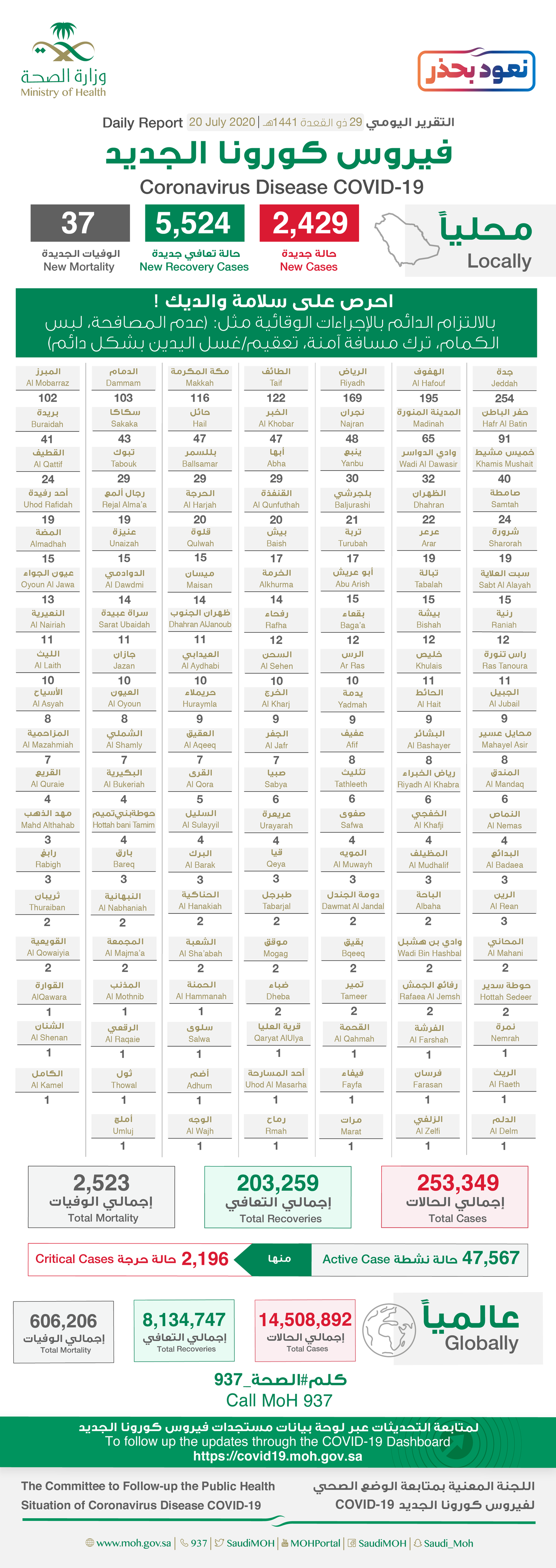 وقالت الوزارة: إنه تم تسجيل 5524 حالات تعافٍ، بذلك يصبح إجمالي عدد الحالات المتعافية 203259 حالة ولله الحمد.